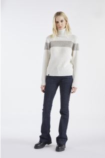 Warm and enveloping high collar sweater in angora blend yarn and lurex insert with a chromatic division into three large stipes cross the garment horizontally.