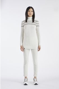 Warm and enveloping loose sweater with high collar in angora and lurex blend yarn with multi-coloured decoration on the shoulders.