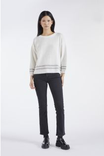 Warm and enveloping loose sweater with crew-neck in angora and lurex blend yarn. Multi-coloured decorations on the hem and cuffs