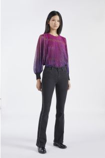 Flared fit denim trousers with an application of tiny rhinestones on the sides