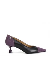 Two-tone women's court shoes in suede and nappa leather with an elegant and feminine style. reel heel height 65mm. soft leather insole.