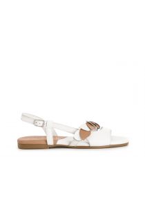 Low leather sandals with asymmetrical strap that ties behind the ankle. two-tone front decoration resembling interwoven leaves.