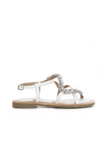 Asymmetrical leather sandals with jewel accessory and low heel.