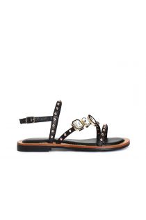 Asymmetric nappa sandal with studs and multicolor stones. the lining and insole are in leather. the heel is high h. 1.5 cm. comfortable shoe even after several hours of use and perfect to combine with multiple looks.