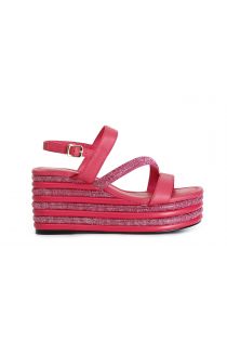 asymmetrical rhinestone and napa leather sandals with rhinestone-striped wedge hot pink