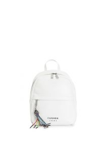 Backpack with embroidered logo and personalised key ring with charm. large zipped front pocket. backpack with single compartment. adjustable shoulder straps.