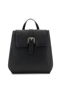 Faux leather backpack with a flap, contrasting ribbed details, and a jeweled buckle on the front. Elegant and practical, perfect for urban chic looks.