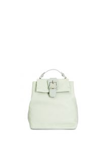 Backpack with monogram print flap covered buckle closure top handle back zip pocket and metal lettering for a sophisticated style.