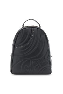 Faux leather backpack with wavy quilting and decorative rivets. Features a front pocket and top handle. Urban style and refined details.