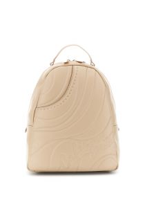 Faux leather backpack with wavy quilting and decorative rivets. Features a front pocket and top handle. Urban style and refined details.