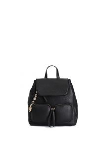 Backpack with front pockets and personalized metal charm with zip closure. drawstring closure. adjustable shoulder straps.