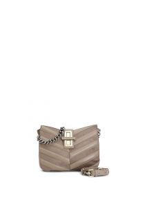 Bag with padded strip applications. twist turn lock closure with cafènoir logo. double compartment and zipped pocket. double shoulder strap both in chain and in the same material as the bag.