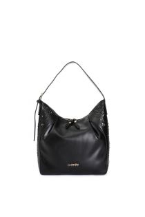 bag with pleats, floral laser-cut, decorative rivets and adjustable handle black