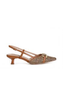 Raffia effect slingback pump with lace and horsebit. slim shape. leather insole. 5 cm spool heel. footwear that combines elegance and modernity. ideal for adding a sophisticated touch to any outfit.