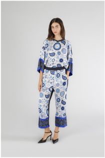 Bi-material jogger trousers with elasticated waist. the front is made of a printed viscose satin and the back is made of jersey. with a soft line they are comfortable and at the same time fashionable for an impeccable casual look.