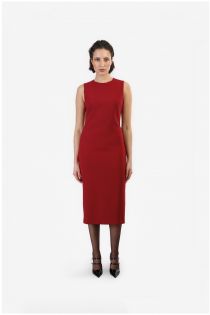 Crew-neck sheath dress below-the-knee length. the dress is sleeveless and made of bi-stretch fabric. on the back there is a teardrop opening with a golden accessory and a rear closure with a concealed zip. small central rear vent. the garment has a slim fit that flatters the silhouette perfect for the office.