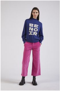 Cyclist-style collar sweater made of a warm and soft angora-blend yarn. the shirt reproduces our slogan 'be noir' in a contrasting colour. a delicate line of rhinestones frames the lettering.