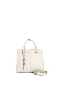 Elegant handbag in material with a fine grain tubular handles with refined application of golden metal lettering. complete with removable shoulder strap for added versatility.