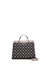 Bowling bag with contrasting colour partition, made of faux leather with floral logo print, contrasting colour handles and hardware for attaching oval handles