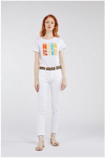 Brigitte trousers are a symbol of freedom, an acclamation of the ethnic chic style is captured by the decorative ribbon at the waist. The skinny fit model is made of bull denim canvas in different colours that combine white and black, a warm barley colour and a strong olive green.