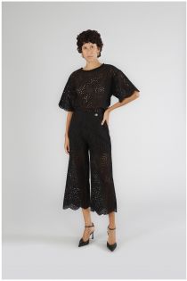 Palazzo trousers made in broderie anglaise fabric. model with side zip and lining shorts. perfect trousers for a romantic and versatile look.