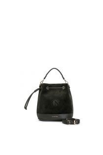 Velvet drawstring bucket bag with embossed logo. metal plate with cafènoir logo. bucket with adjustable shoulder strap.