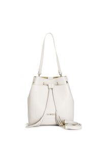 Bucket bag with drawstring and lace with tassels. open pocket in front. short and long double shoulder strap with snap hooks.