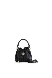 Bucket bag with drawstring in pleated metallic material with metal logo detail with rhinestones. removable shoulder strap.