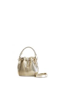Bucket bag with drawstring in pleated metallic material with metal logo detail with rhinestones. removable shoulder strap.