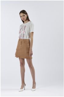 Miniskirt with large side pockets in bull denim stretch fabric. visible buttons. frayed raw cut hem.
