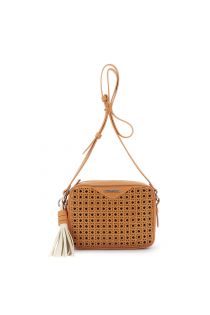 Leather-look camera bag with a geometric perforation on the front a back pocket and a decorative two-tone tassel. compact and versatile with an adjustable shoulder strap it's ideal for everyday and urban looks. dimensions: 20 cm (length) × 14 cm (height) × 6 cm (depth)