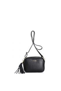 camera bag in textured leather with shoulder strap with snap hooks and tassel black