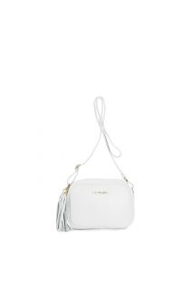 camera bag in textured leather with shoulder strap with snap hooks and tassel white