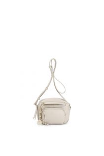 Camera bag with front pockets and personalized metal charm. single compartment and internal zip pocket. zipper closure.