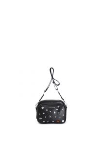Camera bag with subject rivet applications. double compartment and double zip. removable shoulder strap.