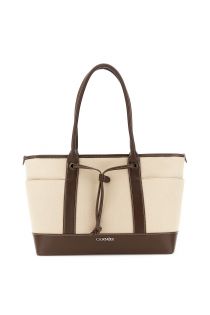 canvas-effect shopping bag with contrasting leather-effect trim dark brown/beige