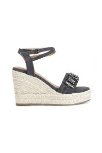 Canvas sandals with applications on the upper. 10.5 cm rope wedge and 3.5 cm platform. ankle strap. leather insole.