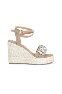 Canvas sandals with applications on the upper. 10.5 cm rope wedge and 3.5 cm platform. ankle strap. leather insole.