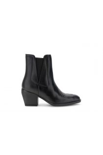 Leather ankle boot with elastic side, tapered silhouette and bold stitching. Leather lining and insole. 7 cm block heel. A bold must-have for urban looks.