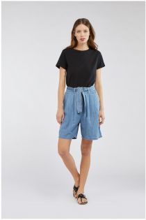 Soft shorts in chambray fabric with passementerie applied on the pocket opening and the jewel button adds a fine touch
