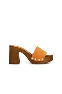 Clogs with split leather strap available in 6 colours. dark wood platform and medium heel and suede insole that matches the colour of the strap.