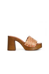 Clogs with wooden heel and decorative two-tone woven raffia strap.