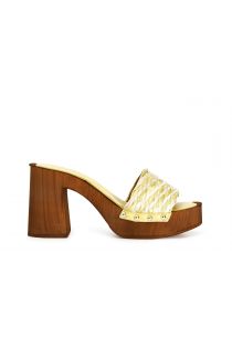 Clogs with wooden heel and decorative two-tone woven raffia strap.