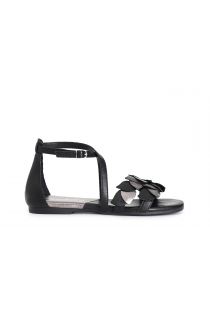 Low leather sandals closed at the back and with a double strap that criss crosses and ties at the ankle. two-tone front decoration resembling interwoven leaves.
