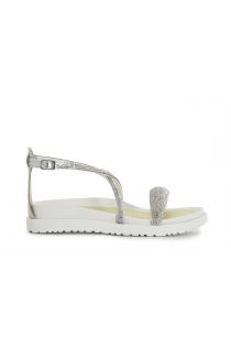 Criss-cross sandals with rhinestones arranged on a flat strap and a criss-cross on the instep that closes with a strap.