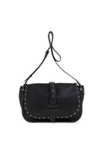 Flap in faux leather with a distressed, faded effect, studded trim, and a central strap. Metal lettering, a back pocket, and an adjustable shoulder strap add a bold touch.