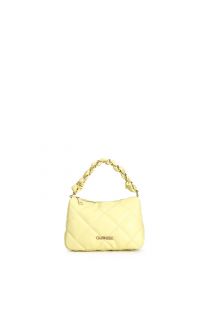 Clutch bag made of soft material with diamond quilting and chain handle with threading with optional shoulder strap.
