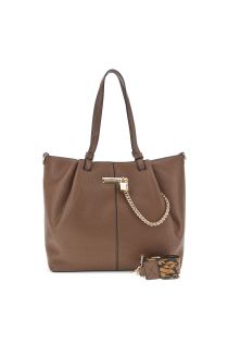 Grainy leather-effect shopping bag with logo chain and padlock. Removable animalier ribbon shoulder strap for a bold, ultra-feminine look.
