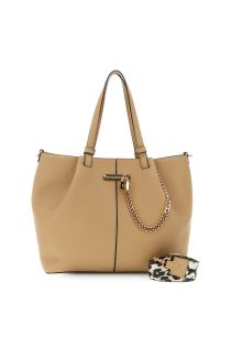 Grainy leather-effect shopping bag with logo chain and padlock. Removable animalier ribbon shoulder strap for a bold, ultra-feminine look.