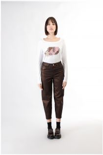 Cocoon fit jeans in laminated gabardine. five pockets and hidden button and zip closure. garment with a contemporary note of a clothing classic. adds originality and glamor to your outfit.